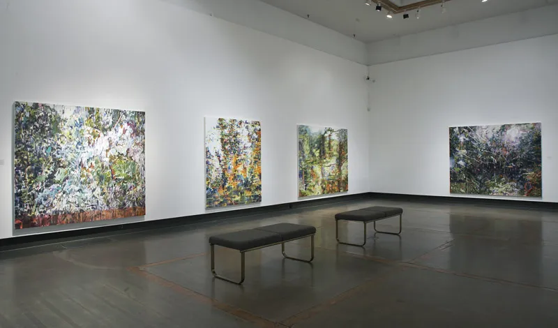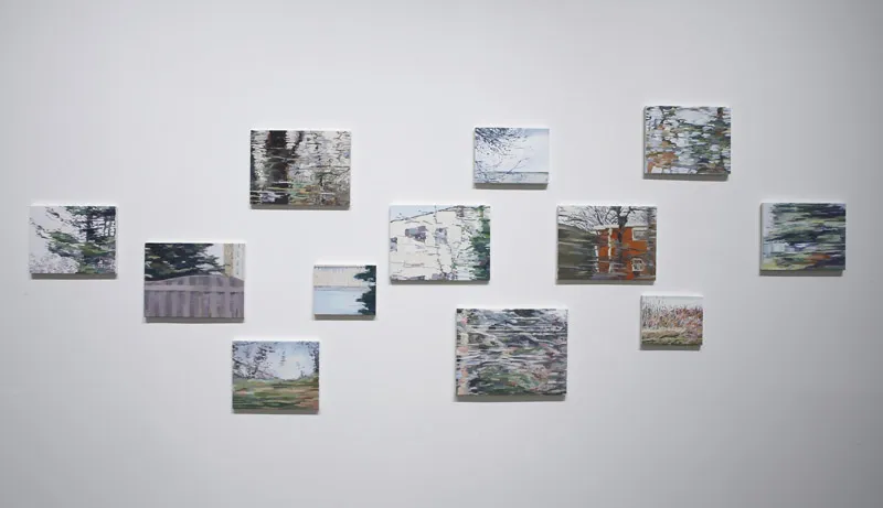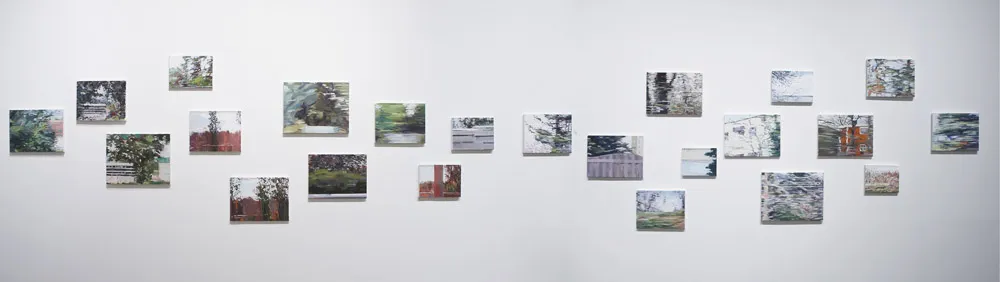 For (séance) part of the Grand River Chronicles at the Kitchener-Waterloo Art Gallery, Monica Tap was invited to respond to the life and legacy of Homer Watson, the celebrated early Canadian painter and local son. Twenty-three small canvases (no larger than 16 x 20”) isolate single frames from video shot along Homer Watson Boulevard, many of which include passing structures—industrial buildings, guard rails, poles—an ironic backdrop for a road named after a landscape painter and conservationist. The large canvases, also based on video stills, shift the focus: two draw on footage from a canoe drifting the Grand River, while two others come from a trip to Lily Dale, New York, where Tap consulted a medium in an attempt to reach Watson himself—an encounter that gave the exhibition its title.