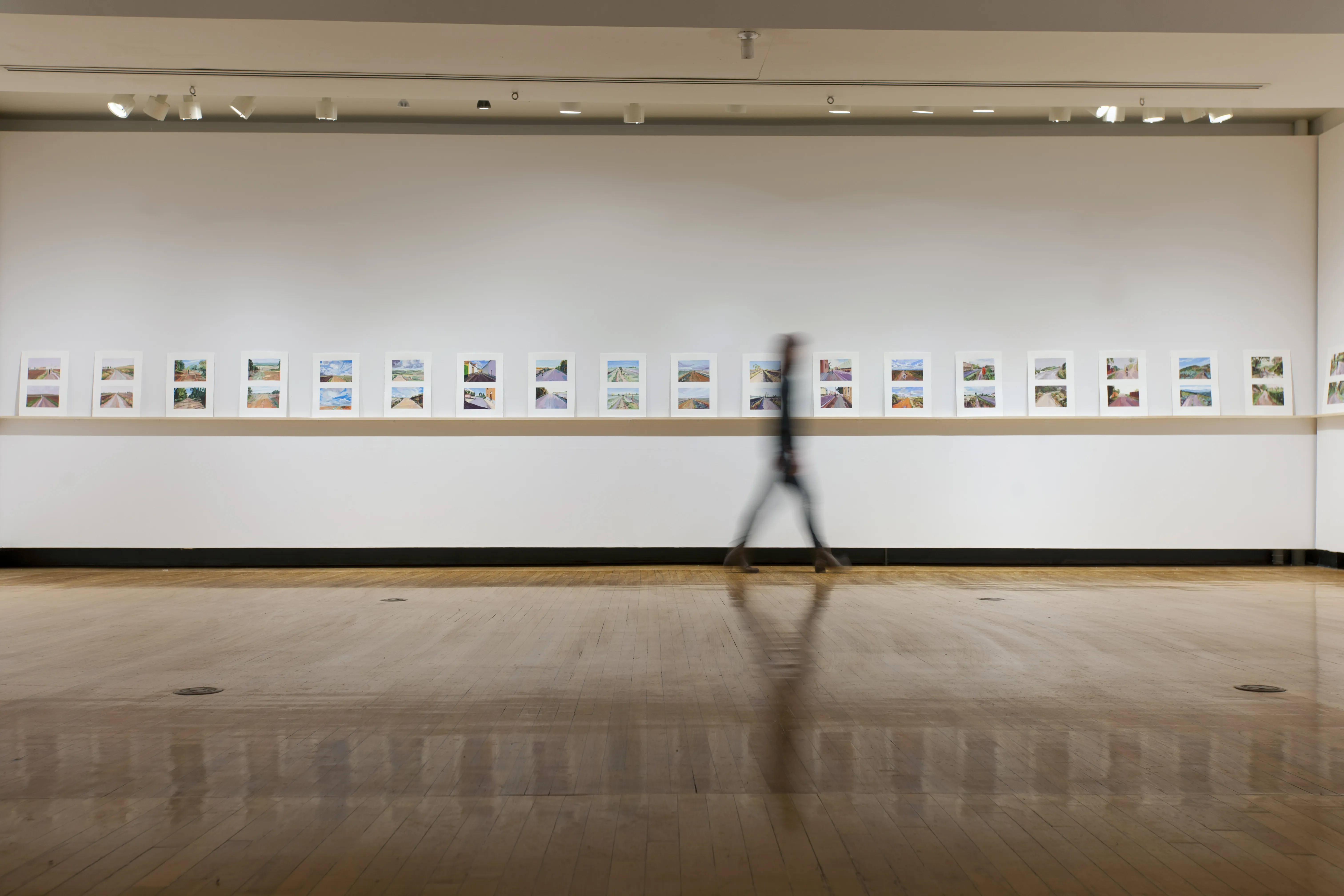 In the fall of 2012, I walked the length of the Camino Francés, traveling the eight hundred kilometers from Saint-Jean-Pied-de-Port in France to Santiago de Compostela in Spain. Every hour, on the hour, I paused to photograph the road ahead and the road behind. Over thirty-two days, I collected more than two hundred pairs of images. Back in my studio, I selected one pair from each day and translated them into the drawings you see here.