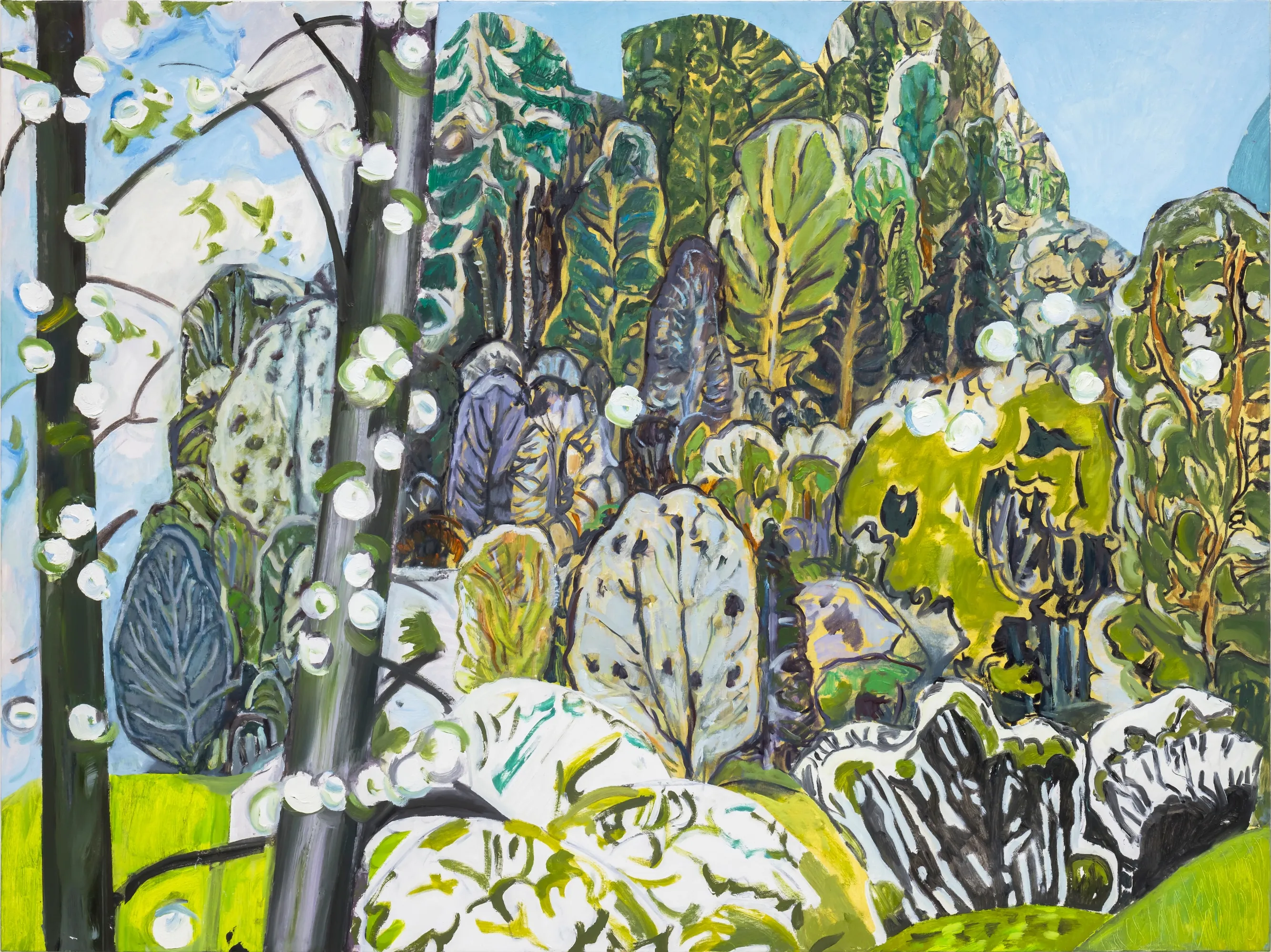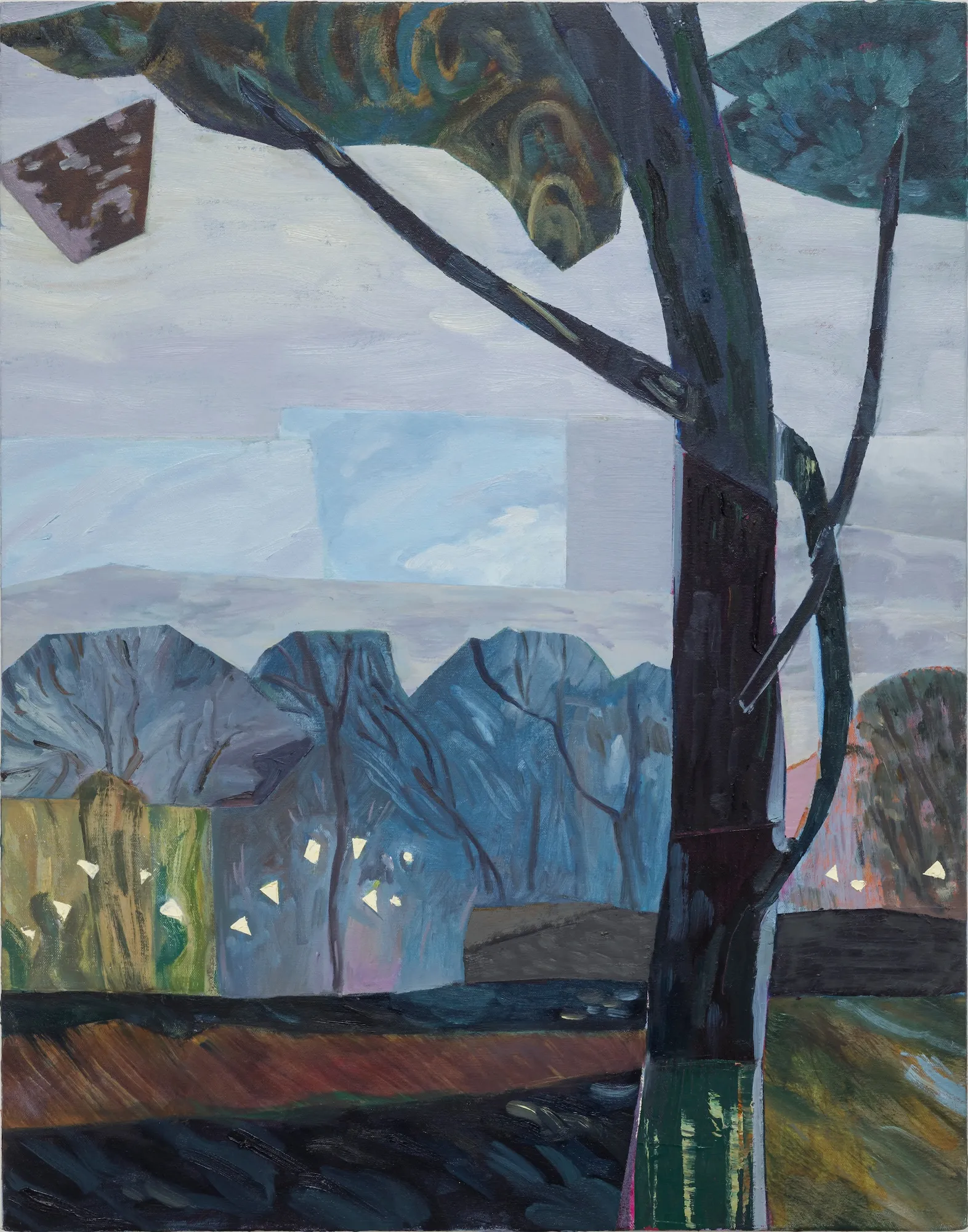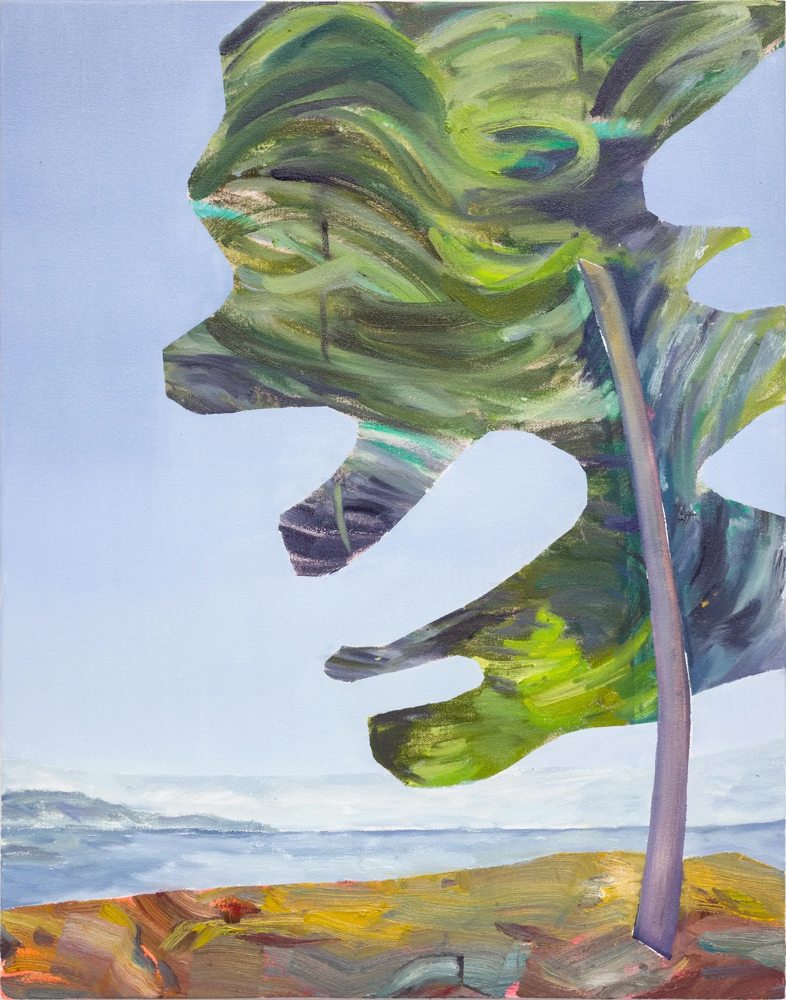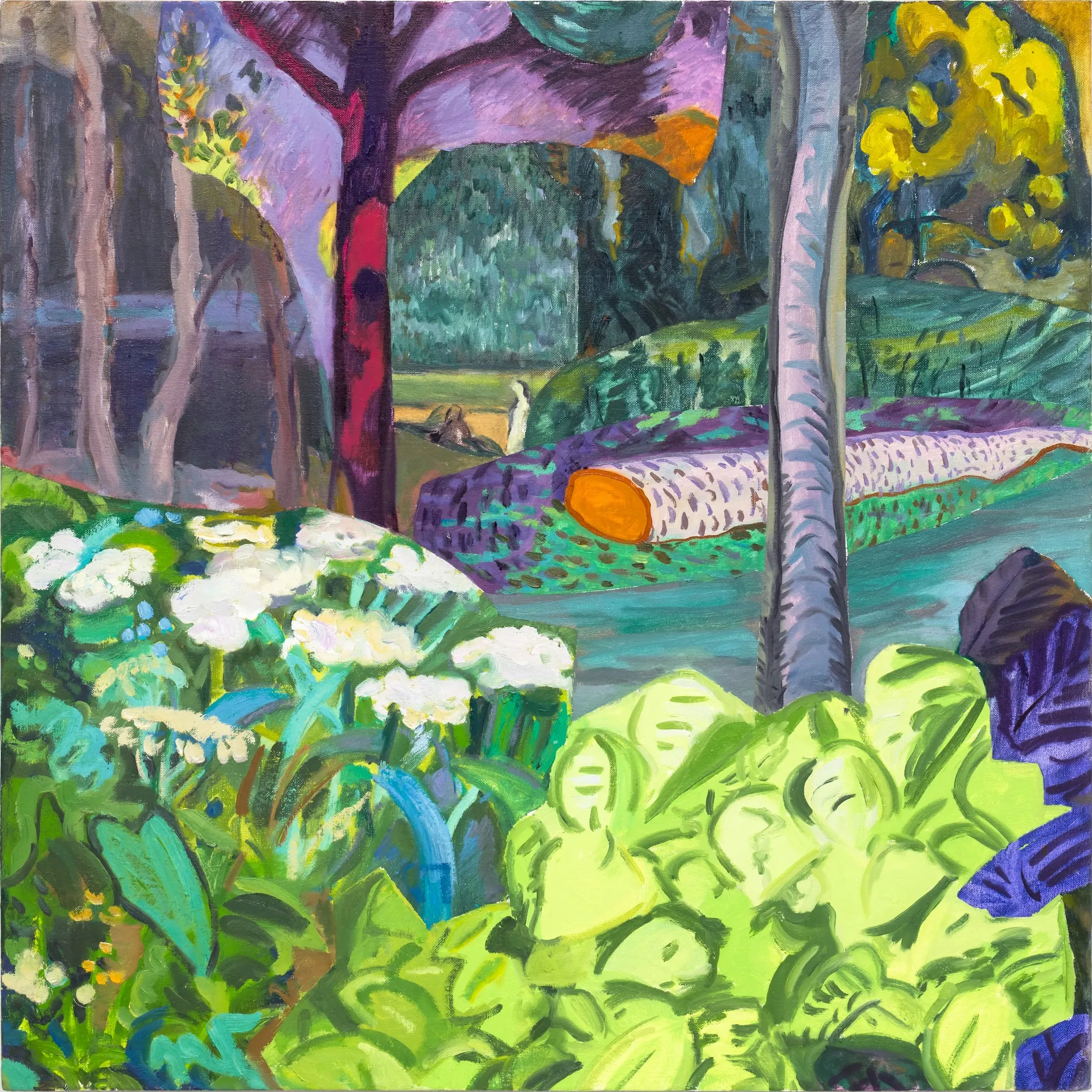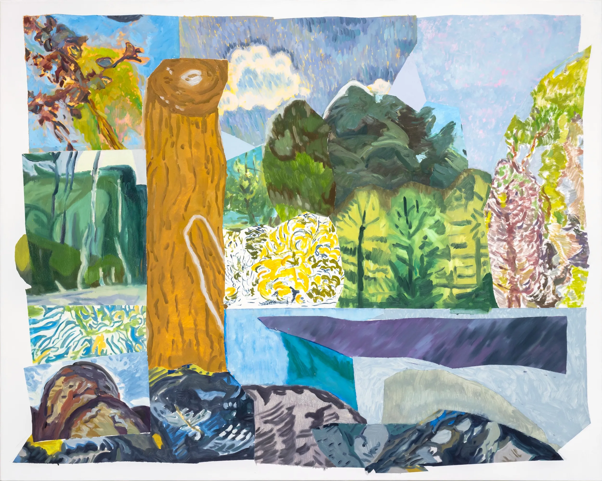 These paintings grew out of my experience of Ontario Place's West Island, a mature forest and public park that faced demolition. I work by harvesting images from decommissioned auction catalogues, primarily of Canadian art, tearing them apart and reassembling the fragments into collaged compositions that become the source for my paintings. The titles come from W.S. Merwin's poem Unchopping a Tree, which describes the impossible task of reconstructing a felled tree, leaf by leaf, spider web by spider web.When 850 trees were slated for removal, Merwin's meditation on nature's complexity felt urgent. On October 3rd, the forest was razed overnight. The following morning, as the last trees fell, I read the poem aloud. That moment is captured in the video Reading Merwin at Ontario Place. Some of these paintings were made after that loss, reflecting on what it means to witness destruction and to try, however futilely, to put things back together. In several works, small figures stand among the trees, dwarfed by the task.